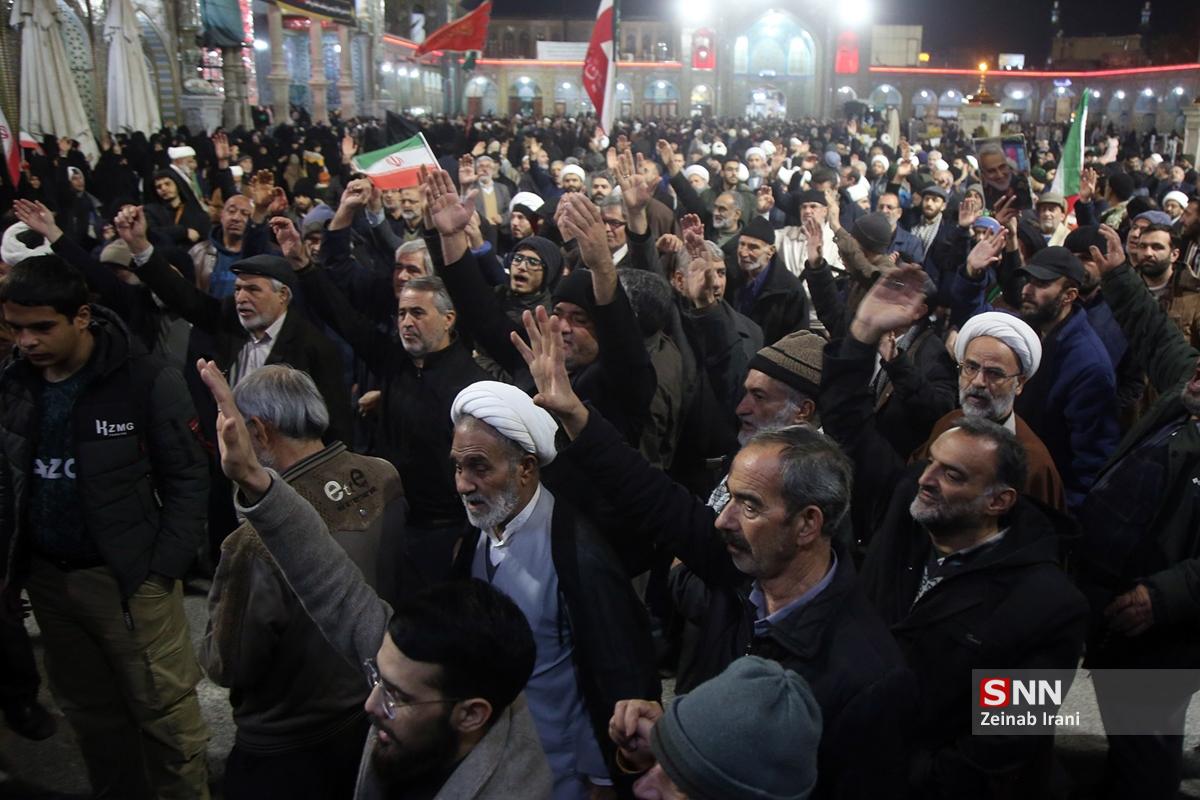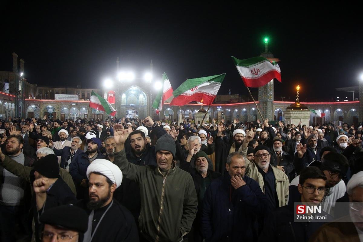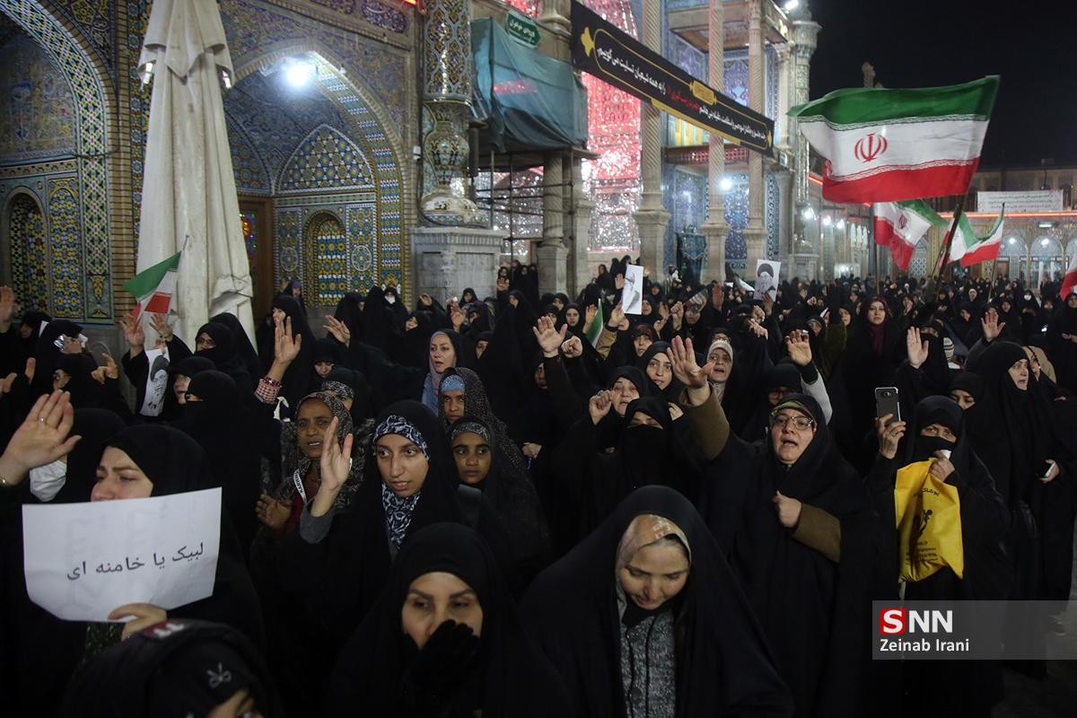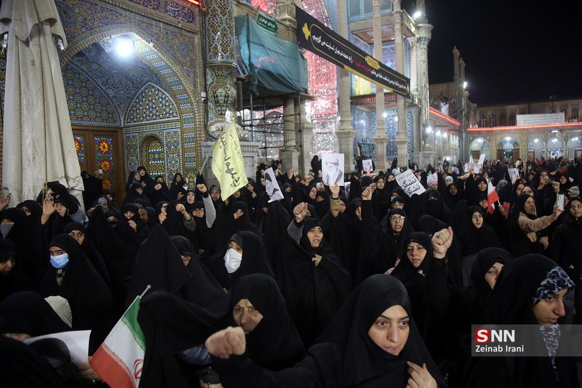 مردم انقلابی و همیشه در صحنه قم با همراهی هیئتهای مذهبی همزمان با شام شهادت حضرت زینب کبری سلام الله علیها با حضور پرشور علیه آشوبگران و برهم زنندگان نظم کشور تجمع و این اقدامات را محکوم کردند.