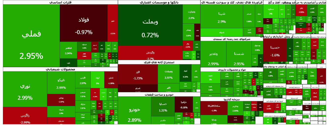 در بازار بورس، نمادهای فملی، فارس و شپنا بیشترین تأثیر مثبت را بر رشد شاخص کل داشتند. همچنین، نمادهای وبملت، فملی و خودرو در زمره پرتراکنشترین نمادهای امروز این بازار بودند.