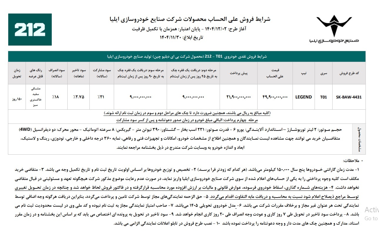 وی با اشاره به تقاضای بالای خریداران از این خودروی لوکس از زمان معرفی محصول، ادامه داد: شرایط فروش خودروی لوکس ۲۱۲ T۰۱ تیپ Legend از روز شنبه ۲ اسفندماه ۱۴۰۴ آغاز و تا اطلاع ثانوی ادامه خواهد داشت.