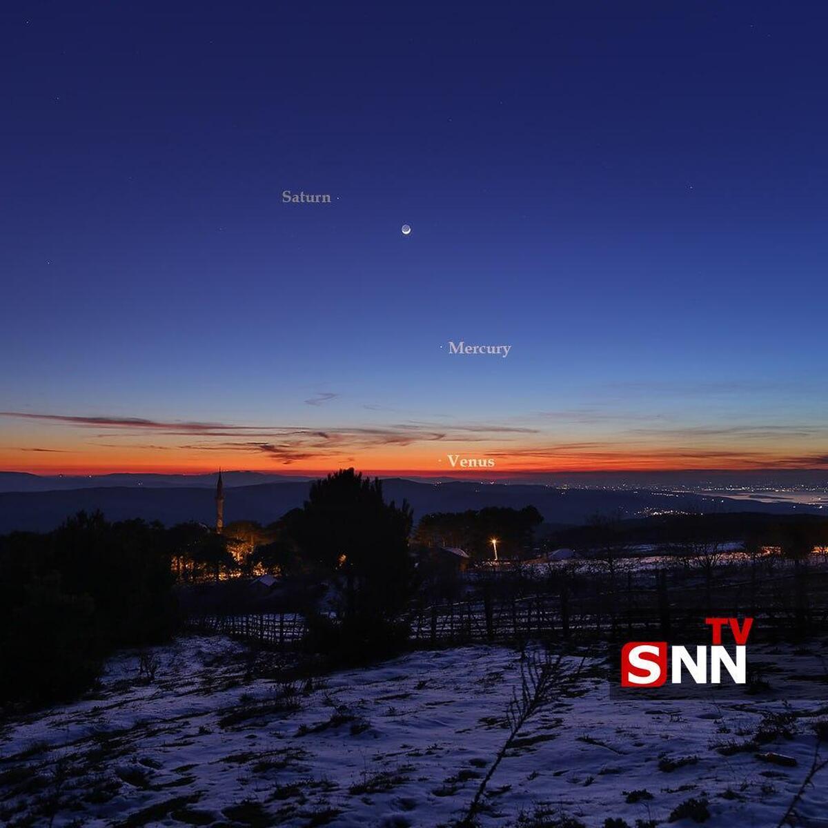 به گزارش گروه دانشگاه خبرگزاری داشجو، تصویری از آسمان گرگ‌ومیش زمستانی، تنها دو روز پس از خورشیدگرفتگی ماه نو هلال باریک ماه را بر فراز افق غربی به نمایش گذاشته است و در این تصویر که بر فراز روستای «کیرازلی» ترکیه ثبت شده، بخش تاریک ماه با نور بازتابی زمین به‌صورت محو دیده می‌شود و سه سیاره درخشان نیز آن را همراهی می‌کنند.