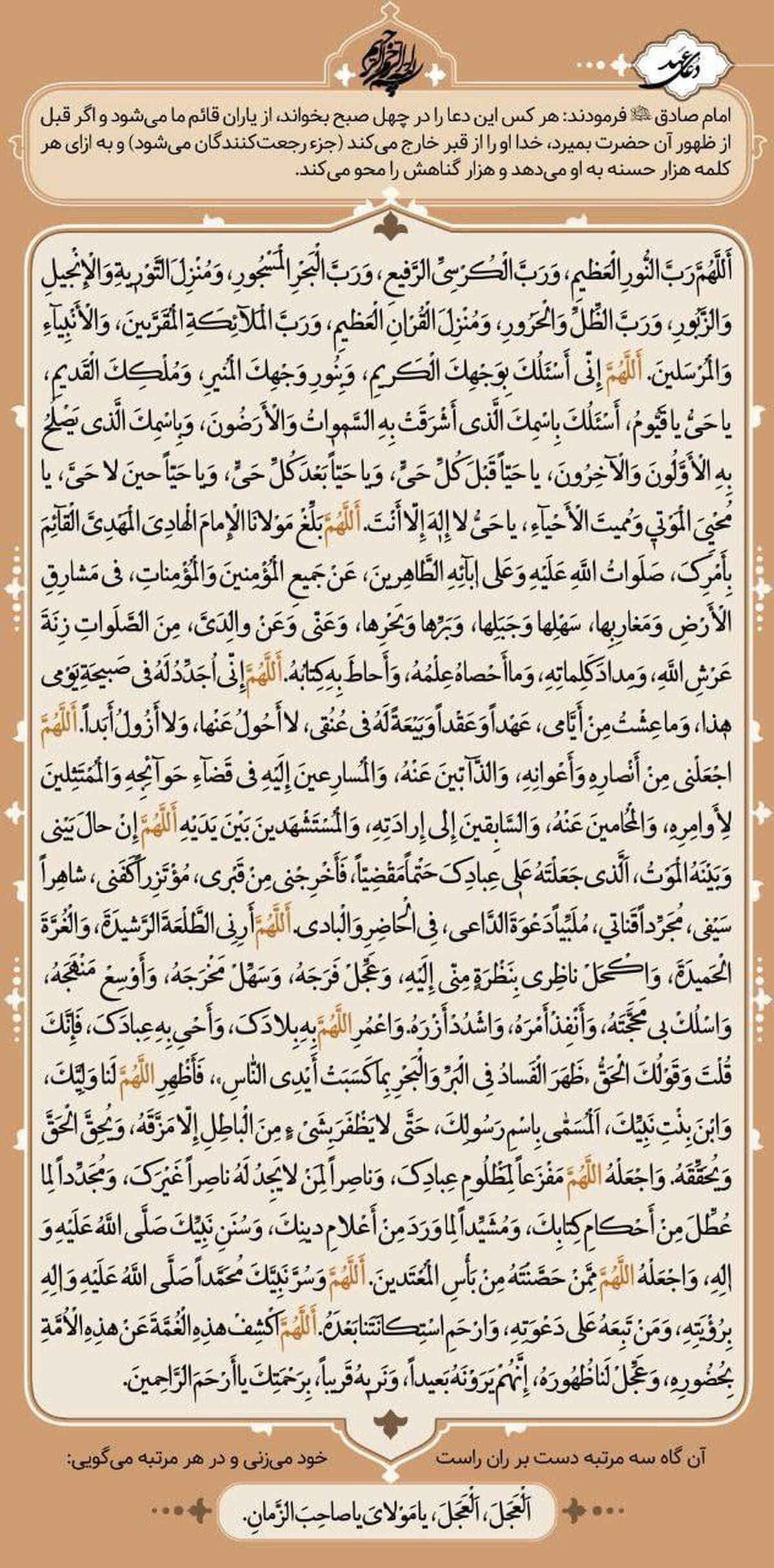 به گزارش گروه فرهنگ و هنر خبرگزاری دانشجو، امام صادق علیه السلام فرمودند: «هر کسی این دعا را در چهل صبح بخواند، از انصار قائم ما میشود و اگر پیش از ظهور وفات کرده باشد، خدا او را از قبر خارج میکند و جزو رجعتکنندگان قرار میدهد.