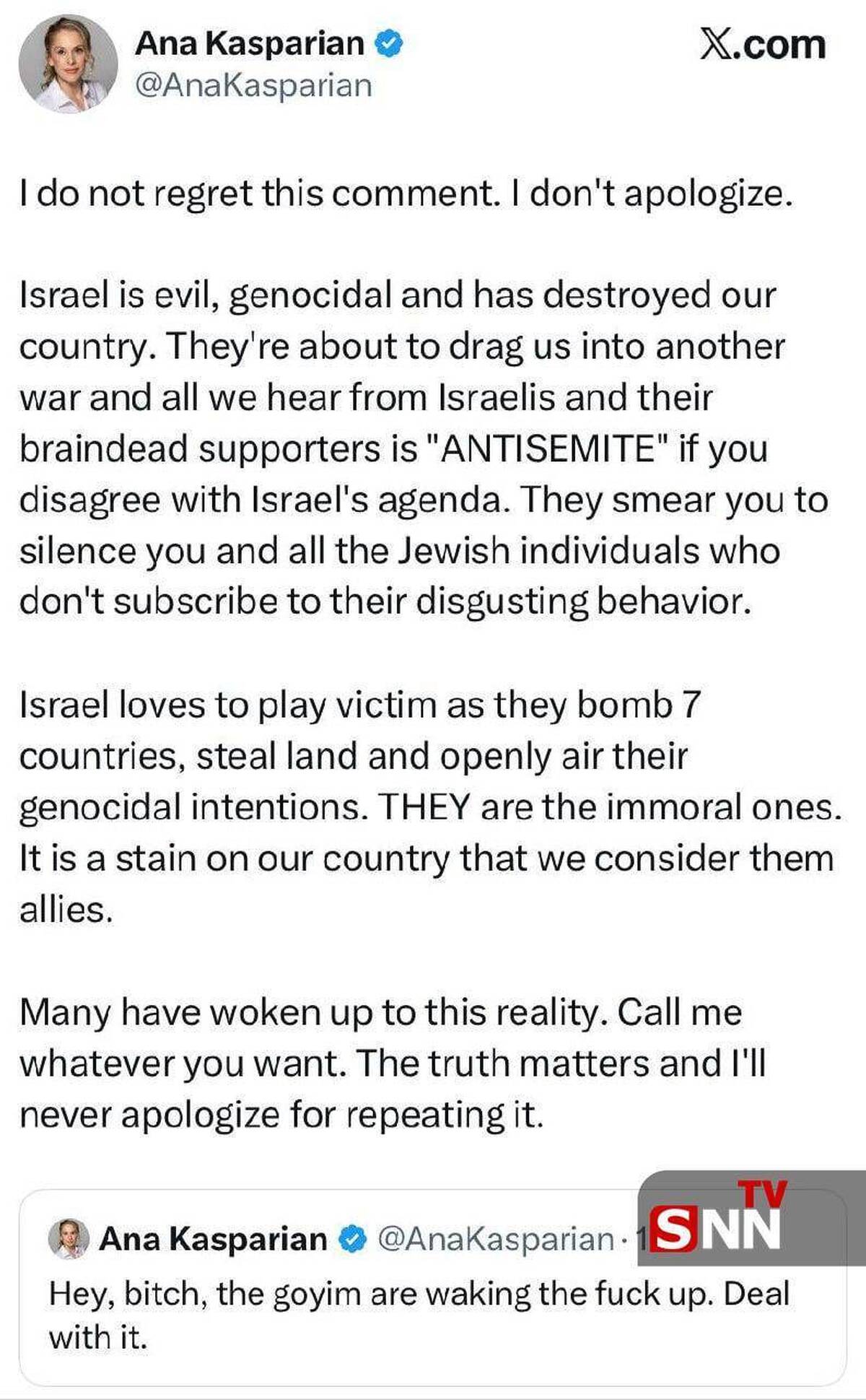 انا کاسپاریان: بابت گفتن حقیقت درباره اسرائیل عذرخواهی نمی‌کنم