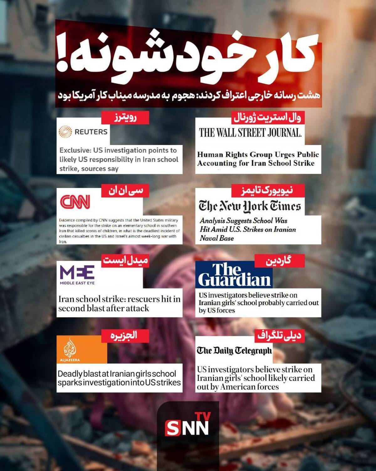 به گزارش گروه بین الملل خبرگزاری دانشجو؛ هشت رسانه خارجی اعتراف کردند: حمله به مدرسه میناب کار آمریکا بود.