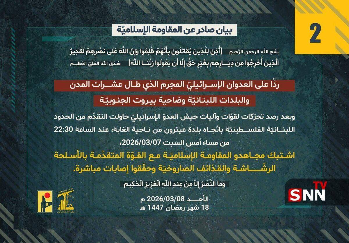 بر اساس این بیانیه، پس از رصد تحرکات نیروها و خودروهای نظامی ارتش اسرائیل که قصد پیشروی از سمت منطقه جنگلی به سوی شهرک «عیترون» را داشتند، رزمندگان مقاومت ساعت ۲۲:۳۰ شامگاه شنبه (۷ مارس ۲۰۲۶) با سلاحهای سبک و راکت به این نیروها حمله کردند.