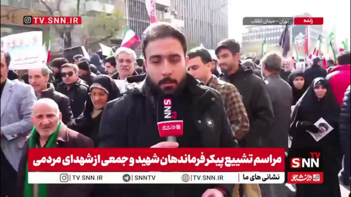 گزارش شایان دنیادیده، خبرنگار SNNTV:مراسم باشکوه تشییع پیکر شهدا در میدان انقلاب اسلامی در حال برگزاری است.جمعیت گسترده امروز در خیابان انقلاب اسلامی تهران حضور پیدا کردند؛ جمعیت کاملا فشرده است و حتی راه رفتن با مشکل مواجه شده است.پیکر شهدا در حال به سمت معراج شهداست و مردم روزه دار شهر تهران در روز شهادت امیرالمومنین در حال تجدید بیعت با آرمانهای انقلاب اسلامی هستند.