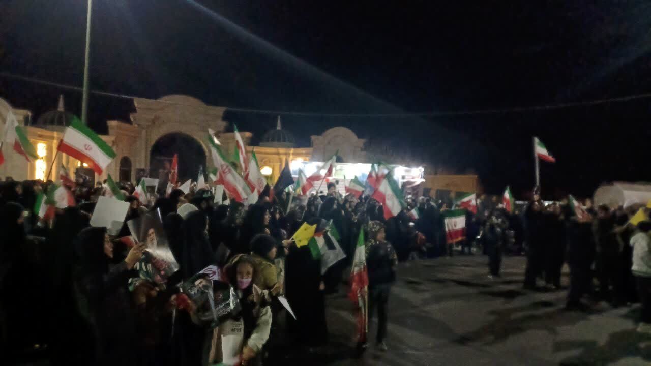 در جریان این راهپیمایی شبانه، شعارهای «نه سازش، نه تسلیم، نبرد با آمریکا»، «مرگ بر اسرائیل» و «انتقام، انتقام» در فضای شهرستان طنینانداز شد.