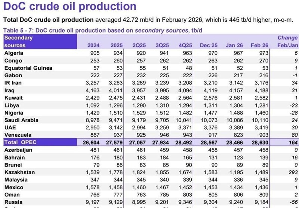 تولید نفت ۱۲ کشور عضو این سازمان بر اساس تازهترین گزارش (ماه مارس ۲۰۲۶)، در ماه فوریه ۲۰۲۶ (بهمن - اسفند)، درمجموع ۲۸ میلیون و ۶۳۰ هزار بشکه در روز بوده که نسبت به ماه ژانویه (دی - بهمن)، ۱۶۴ هزار بشکه در روز افزایش داشته است.