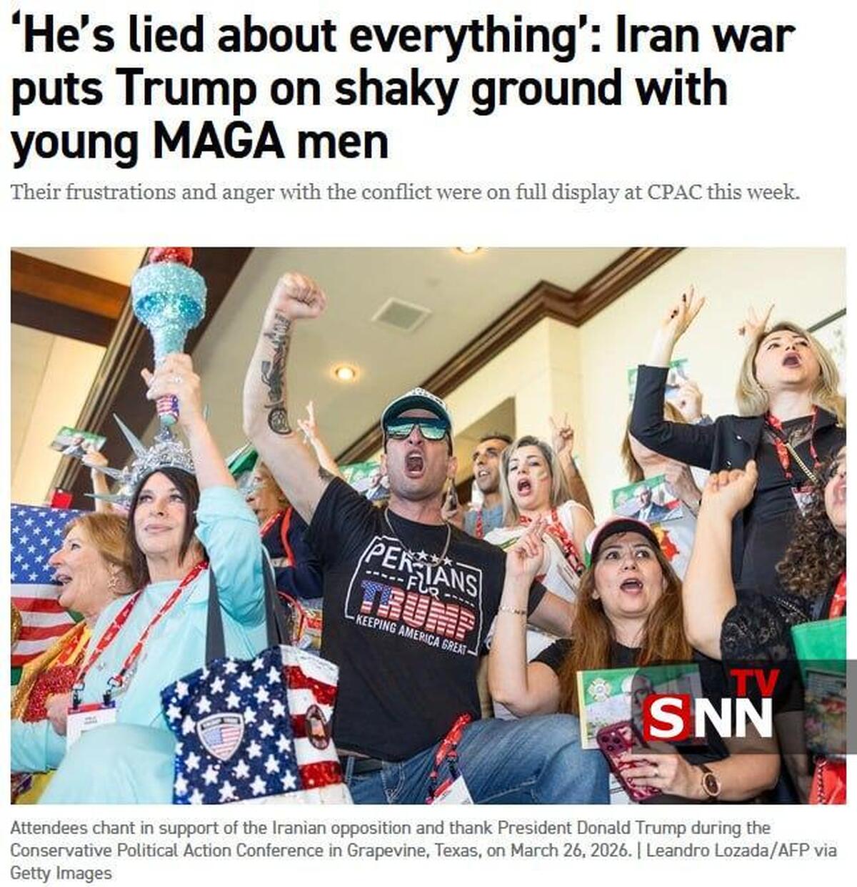 پولیتیکو نوشت که در نشست سیپیایسی در تگزاس، برخی از هواداران جوان ترامپ به دلیل جنگ ایران علیه او موضع گرفتهاند؛ جوزف بولیک، کهنهسرباز جنگ عراق، گفت: «او در همه چیز دروغ گفته... هیچ هدف مشخصی وجود ندارد.»
