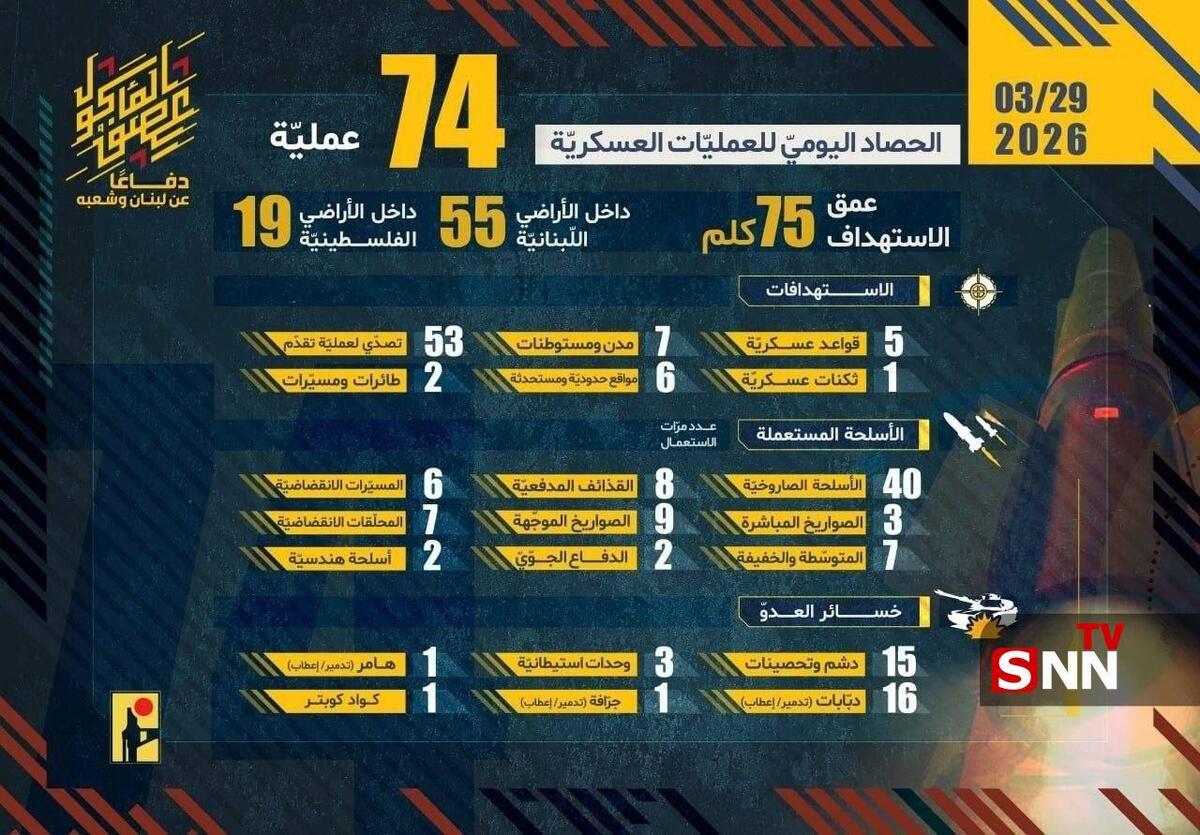 ۷۴ عملیات و شلیک موشک در عمق ۷۰ کیلومتری اراضی اشغالی شاهکار جدید حزبالله است که طی ۲۴ ساعت گذشته ثبت شده.