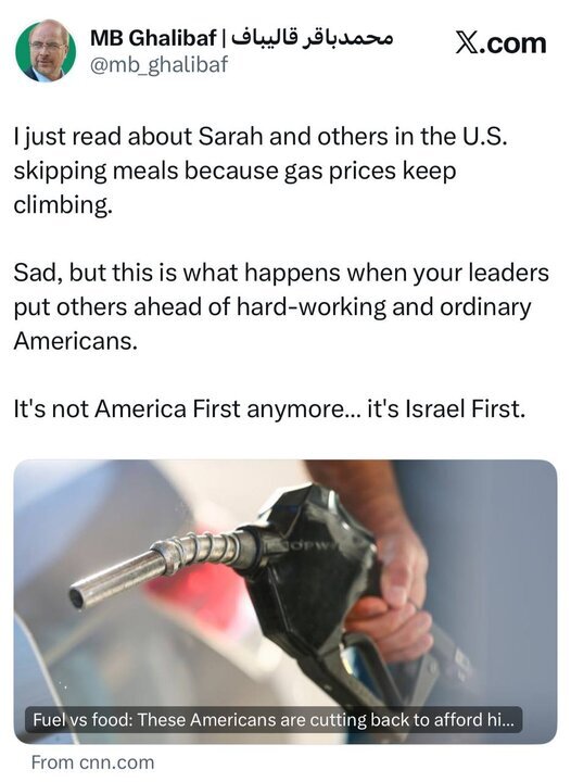 به گزارش گروه سیاسی خبرگزاری دانشجو، محمدباقر قالیباف، رئیس مجلس شورای اسلامی، در مطلبی به زبان انگلیسی با استناد به گزارش CNN در صفحه شخصی خود در شبکه اجتماعی ایکس، به پیامدهای افزایش قیمت سوخت بر زندگی مردم آمریکا اشاره کرد.