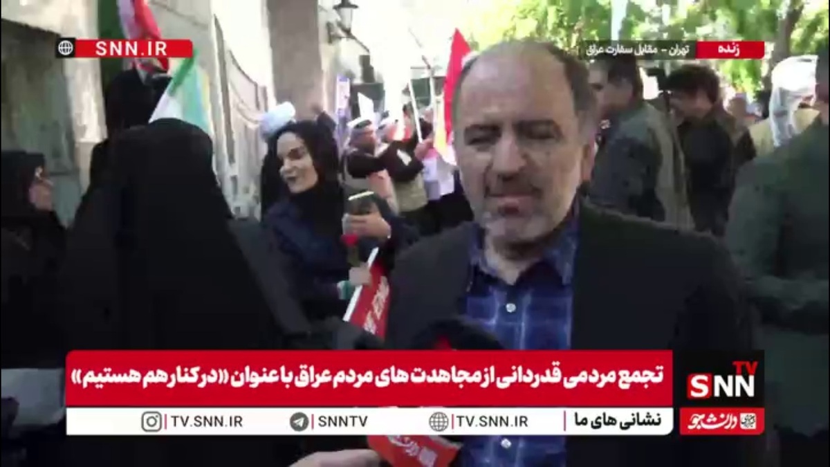 استاد دانشگاه در گفتگو با SNNTV:ما ۱۳ فروردین مقابل سفارت اسپانیا رفتیم امروز سفارت عراق آمدیم، شنبه هم مقابل سفارت یمن، دوشنبه مقابل سفارت ترکیه و چهارشنبه نیز مقابل سفارت مالزی خواهیم رفت؛ از همه کسانی که در جبهه مقاومت از ما حمایت کردند متشکر هستیم به طور ویژه از مردم عراق.
