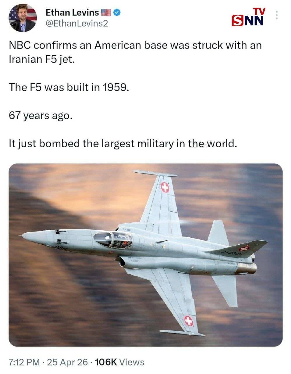 روزنامه نگار آمریکایی نوشت: ان‌بی‌سی تأیید می‌کند که یک پایگاه آمریکایی با جت اف-۵ ایران مورد اصابت قرار گرفته است.