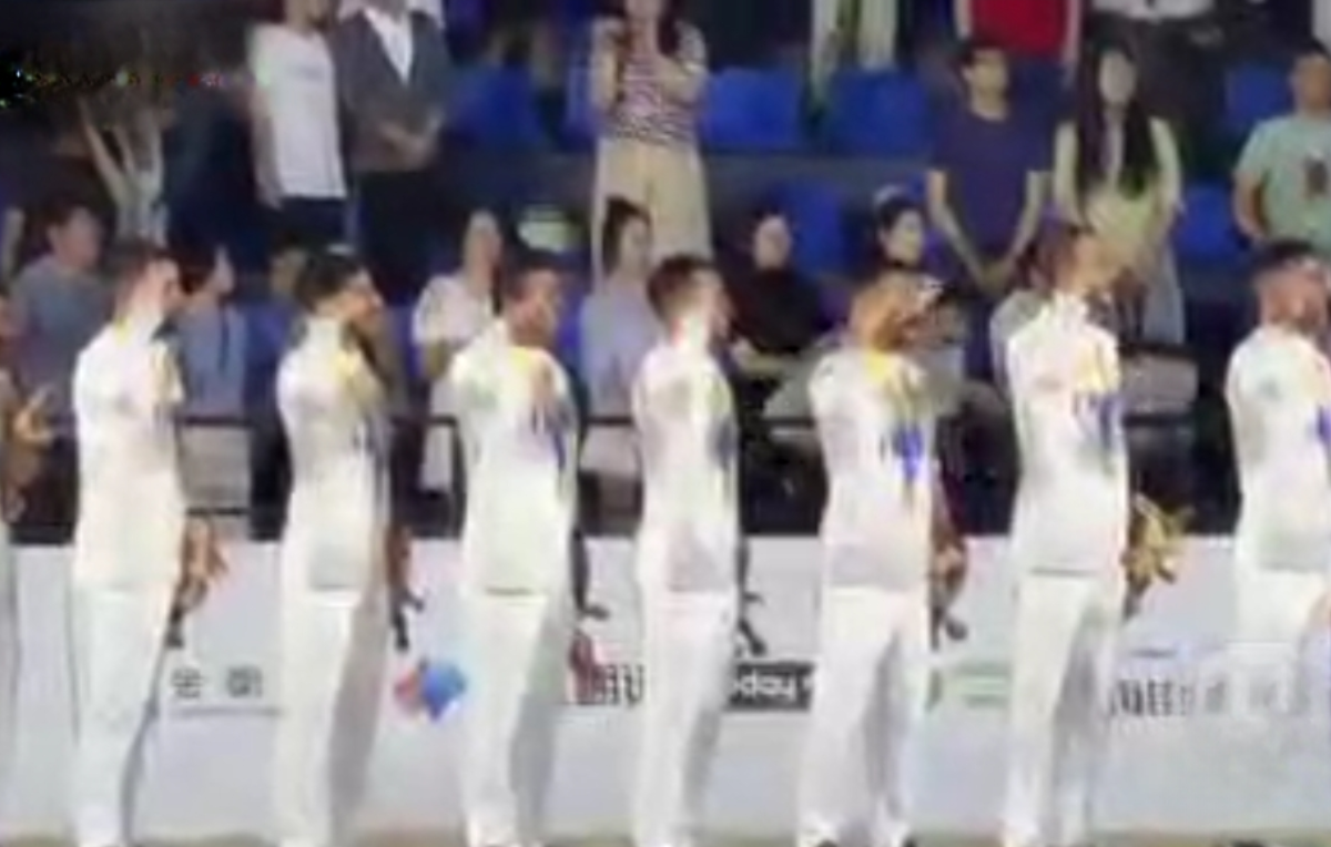 احترام نظامی اعضا و کادر فنی تیم ملی فوتبال ساحلی کشورمان هنگام اهتزاز پرچم سه رنگ کشورمان در مراسم جشن قهرمانی آسیا
