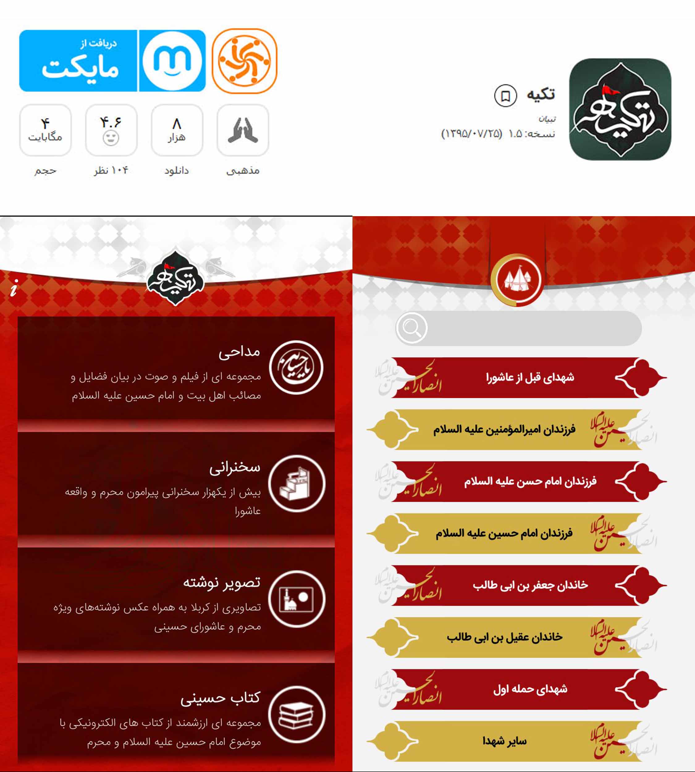 نرم افزار تکیه، اپلیکیشنی بروز و جامع برای ماه محرم میباشد که به صورت آنلاین آخرین ویدئو و صوتهای مداحان و سخنرانان مطرح کشور را در اختیار کاربران قرار میدهد.این نرم افزار شامل بانک بزرگی از اشعار حسینی، پاسخ به شبهات، منتخب ادعیه و معرفی یاران امام حسین علیهالسلام میباشد که کاربران بدون دسترسی به اینترنت میتوانند از آنها استفاده نمایند.از قابلیتهای دیگر این اپلیکیشن؛ استفاده از مداحیها بعنوان رینگتون، دانلود و یا به اشتراک گذاری است، همچنین میتوانید تصویرنوشتههای ویژه ایام محرم را برش و بعنوان پسزمینه استفاده نمایید.