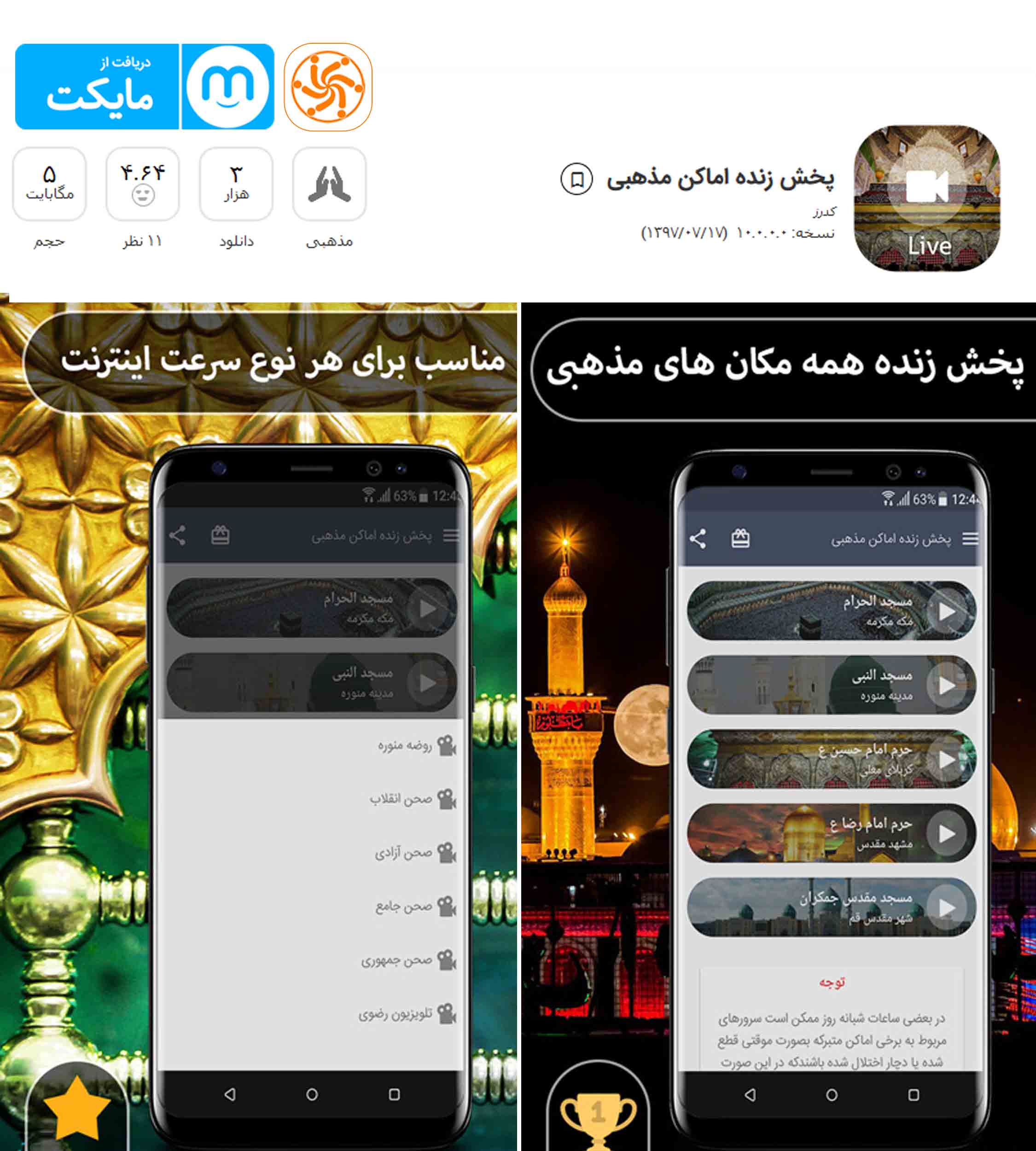 پخش زنده همه اماکن مذهبی (کربلا، مکه، مدینه، مشهد، مسجد جمکران) با کیفیت و سرعت بالا